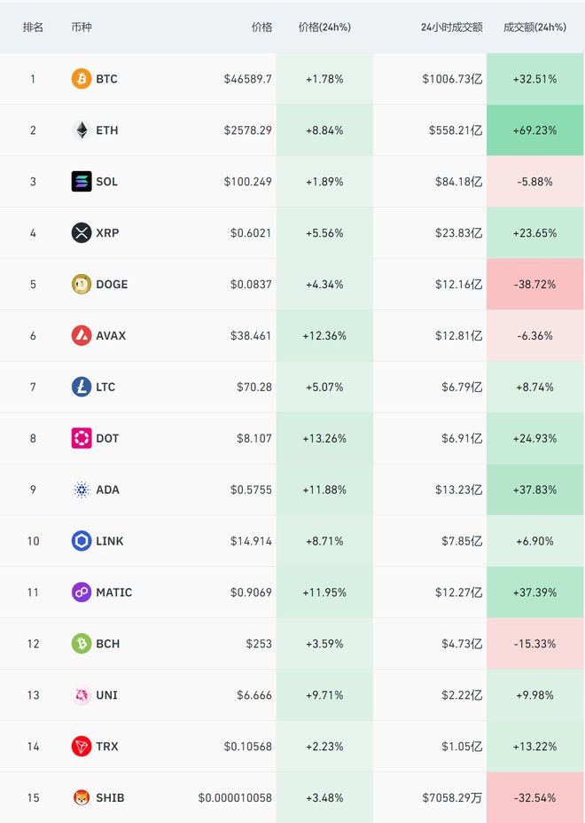 比特币(BTC)过去24h上涨2.12%,**报48500美元,**报44305美元,波动率9.01%。以太坊(ETH)走势相对略弱,上涨5.01%,**报2659美元,**报2227美元,波动率16.81%。