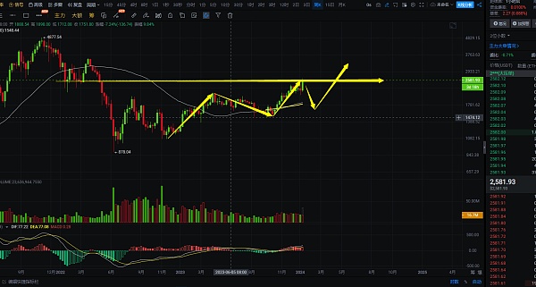以太周线上看,前面突破震荡高点后的压力位置就在2550附近,前面文章我也提到过,现在以太到达压力附近,但是没有下跌的意思,多头还是有点强势,以太目前空单就不着急去做布局 ,收出上影线再去做布局都不迟,如果周线有效突破2550,也就是收线没有收下去,以太下个压力点位会在3000附近,但我个人认为以太这波不会有很大的拉升空间了,大饼开始回调也会带动下以太,以太近期有坎昆升级影响,事件热度过去后,以太也将恢复平静,以太的回调区间预计在1935-1740,到达这个区间再去看后市的拉升突破,那个时候,牛市也就差不多来了,自行把握进场机会;短线交易,控制风险,盈亏自理;