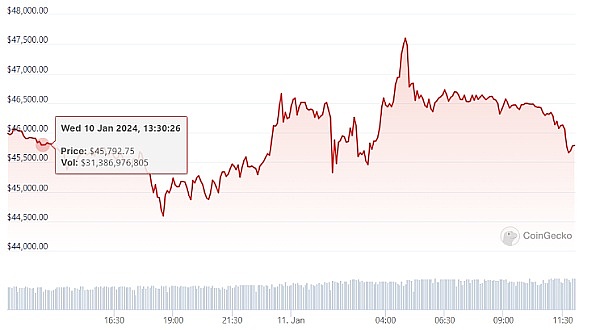 最近,美国证券交易委员会(SEC)批准现货比特币 ETF,在加密货币社区引发了一波热潮。许多专家预测,这一发展将导致比特币价格大幅上涨。然而,自批准以来,市场一直相对停滞,让许多投资者感到困惑。比特币交易价格为 45,729 美元。
