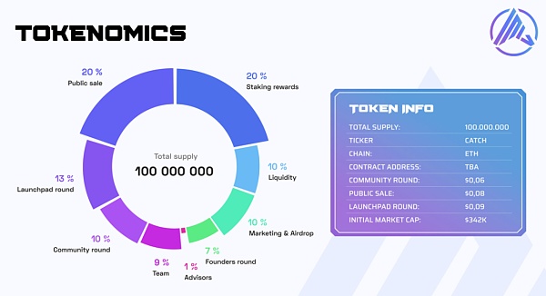 SpaceCatch的**为 CATCH ,总供应量为1亿个,CATCH在社区轮发售的价格为 0.06美元,公开发售为0.08美元,其初始市值为 342,000美元。CATCH不是奖励**,该**只能通过直接购买或质押获得。CATCH 的预售于 2023 年 11 月 12 日开始,现已结束。在预售中购买 CATCH 的**方式是通过SpaceCatch的官网 spacecatch.io 进行购买。
