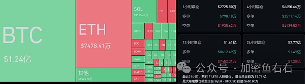 主流 alt-coin 普涨,涨幅上甚至高于 BTC 。截至发文,ETH 暂报 2506.3 usdt, 24 小时涨幅 2.3% ;SOL 暂报 97.54 USDT, 24 小时涨幅 2.69% ;OP 暂报 4.02 USDT, 24 小时涨幅 7.67% ;ARB 暂报 2.19 USDT, 24 小时涨幅 8.57% ;TIA 暂报 15.9 USDT, 24 小时涨幅 9.6% 。据显示,过去 24 小时**爆仓 2.86 亿美元,其中多单爆仓 1.49 亿美元,空单爆仓 1.28 亿美元;从币种来看,BTC 爆仓 1.24 亿美元,ETH 爆仓 7478.41 万美元。
