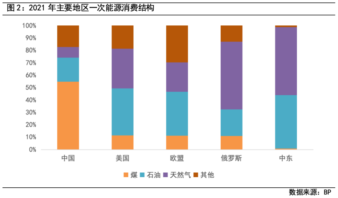 另外,相比欧美、中东等地区以油气为主的一次能源消费结构,煤在我国的能源消费中占比较高,主要由于我国丰富的煤炭资源丰富和先进的开采加工技术所形成的能源经济优势。在能源转型过程中,安全稳定、成本低廉的煤电仍将起到对能源系统平稳运行保驾护航的作用。