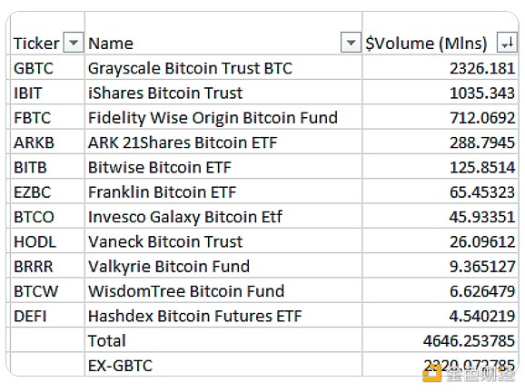 根据 Bloomberg Intelligence 分析师 James Seyffart 在 X 上发布的数据,灰度比特币信托 (GBTC) 是一种现有产品,已经存在多年,但其形式不太理想,其交易量**,达到 23 亿美元。