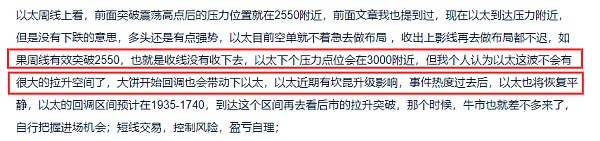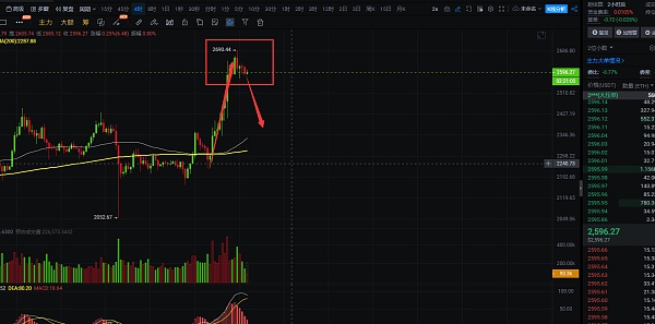 4小时线上看,以太的反弹节奏被打破,上涨的力度也减弱,加上大饼到达周线压力收针,大饼开始走回调,以太是不会一直去走单边的,**还是会跟随大饼去走回调的,4小时线上看,以太白盘的下跌也即将开始,一旦跌破这个高点震荡区间,以太也将加速下跌,下跌区间预计在2400-2325,到达该区间后,后面周线收线收到2550下方,那就说明以太周线压力2550依旧有效,以太后市也就将开始漫长的下跌之路了,短线上,以太可以轻仓做空单的布局,2635如果破了就可以再观望一下,自行把握好进场机会;短线交易,控制风险,盈亏自理;