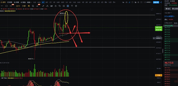 4小时线上看,最近的行情插针比较多,各种针,昨晚也是反弹后收针下来,留下长长的上影线,这跟上影线是触及到压力位48660附近后收下来的,说明周线的压力还是比较大的,大方向是看跌,但行情不是一两天能下去的,可能是一两个月的事,日内短线上根据昨日收线的走势上看,白盘还有下跌空间,预计下跌点位在45300附近,跌破44300,那就是42850附近去了,日内的下方空间还有很大,自行可以把握一下进场的机会,日内短线的压力在46900附近,不破这个位置,空单就没啥问题,自行把握进场机会;短线交易,控制风险,盈亏自理;