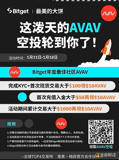 同时为配合AVAV的上线,Bitget推出AVAV**空投活动。活动时间为1月11日-1月18日,获取**为完成KYC **现货交易大于100U即能领10 枚AVAV,**充值入金大于50 U再领10 枚AVAV,在活动期间累计交易大于1000U再领10 枚AVAV。