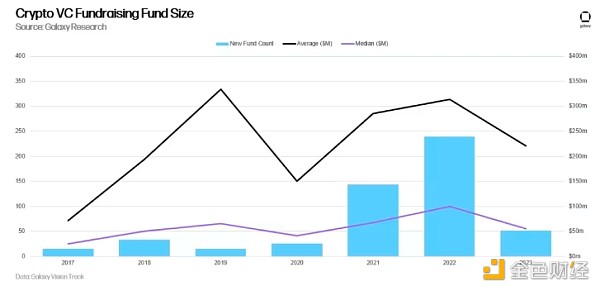 从年度来看,2023 年是自 2020 年以来新推出的加密货币风险投资基金数量最少的一年。平均基金规模同比下降 30%,而基金规模中位数下降 45%。