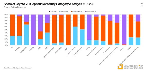 从阶段来看,合规类别中的初创公司偏向种子阶段,而风险投资和托管类别中的资本则严重偏向后期阶段。 如果公司是融资或资本部署的平台,则被归类为“风险投资”。 请注意,一家公司在托管类别中筹集了后期资金,但没有披露交易规模,因此该图表中的一栏基于极其有限的数据。