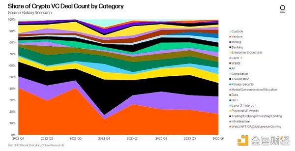 加密货币风险基金的筹款仍然极具挑战性。 宏观环境和加密货币市场基础设施初创公司的动荡,阻碍了分配者对加密货币做出与 2021 年和 2022 年相同水平的承诺。2023 年第四季度,新加密货币风险投资基金数量最少,分配金额也最少。