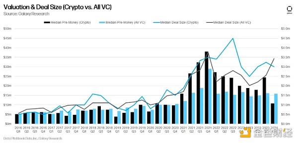 风险投资支持的加密货币公司估值在 2023 年大幅下降,第四季度达到 2020 年第四季度以来的**投前估值中位数,而所有风险投资的投前估值在 2022 年初最初下降后保持相对稳定。 第四季度较 2022 年第三季度 450 万美元的历史高点下降了 33%。
