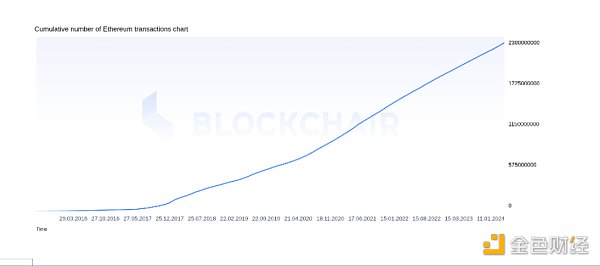 在我2021年的一篇文章中曾提到,一个完整的geth节点大约为350GB(新修剪的)。大约三年过后,一个完整的geth节点(在pbss上)超过900GB。下图显示了交易的总累积量。从中很容易看出,交易量在三年内增加了一倍多,从大约9.8亿笔增加到超22亿笔。