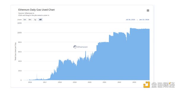 Gas limit决定了一个区块内的工作完成量,因此决定了每个区块可以执行多少交易。提高gas limit将使以太坊能够处理更高的交易吞吐量或更复杂的交易。一直以来,具体的gas limit设置受矿工/质押者影响,并且多年来限额一直在增加。下图来自etherscan.io,显示了gas历史用量(非常接近gas limit,所有限额增加都被市场消化掉了)。
