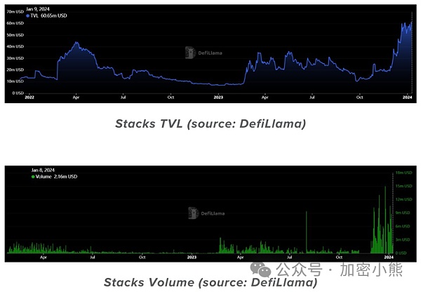 Stacks链上TVL正冲击历史新高,达到6300万美元。较2023年9月的低点(1000万美元TVL)上涨约6倍。过去几个月交易量也大幅增加,这与其生态上NFT、DEX和域名服务的发展相对应。