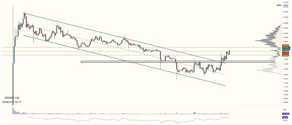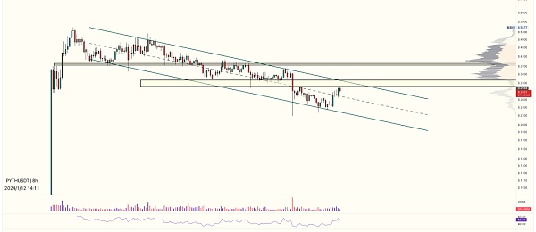 JTO Python 这两个币 的结构特征是一致的,都是通道下跌洗盘,区别在于jto率先完成洗盘并突破,形成显著的底部形态,昨天晚上我是率先建仓的JTO。 道理上说,pyth似乎基本面表现更好?如果说jto突破了,是不是意味着pyth也会突破,只是时间的问题呢? pyth目前依旧还是受制于通道下跌的趋势里,还未走出右侧确认。 jto已经突破 jto是确定性走的比较好,pyth是当前盈亏比更高,但是还没走出突破,确认底部完成的信号。