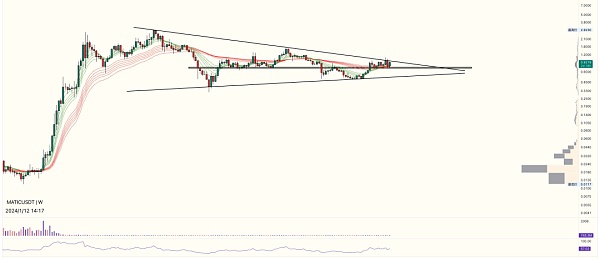 matic 我是从11-12月份开始追踪关注的,一直没有上车,因为一直没有get到他的主升会开启,前不久的一次上攻,其实也是太着急的表现,所以**还是下来了。 当前依旧受制于周k级别,三角压制,均线带目前也呈现出交叉粘合状态(两周内将会出方向),如果周k级别能够实现突破,那么市场环境不拉垮的状态下,有望开启一波主升。 matic是我**关注的标的,个人认为可作为重仓分配的。(当然目前还需要稍微等待下在做**决策)