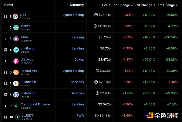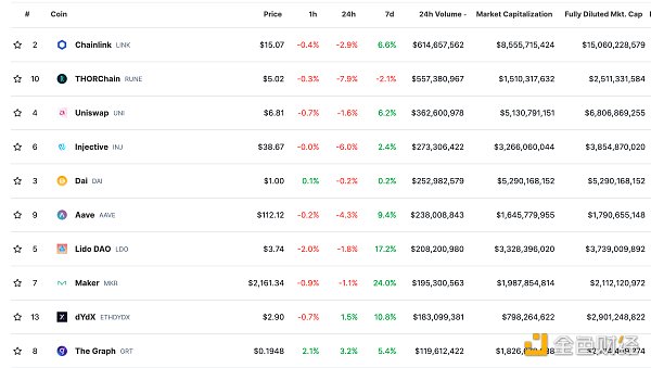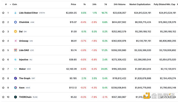 DeFi总市值及前十** 数据来源:coingecko