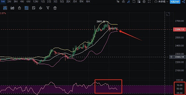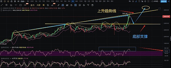 看下极短周期4小时走势价格在上升趋势线附近,当前收报2594处横盘整理;后续如果横盘整理后再次冲破上升趋势线,价格震荡拉升空间看向2770--2900概率会很大。至于这样打的反弹空间如果真的走出想必它的收尾**会是向下插针400-500点的形式结束!