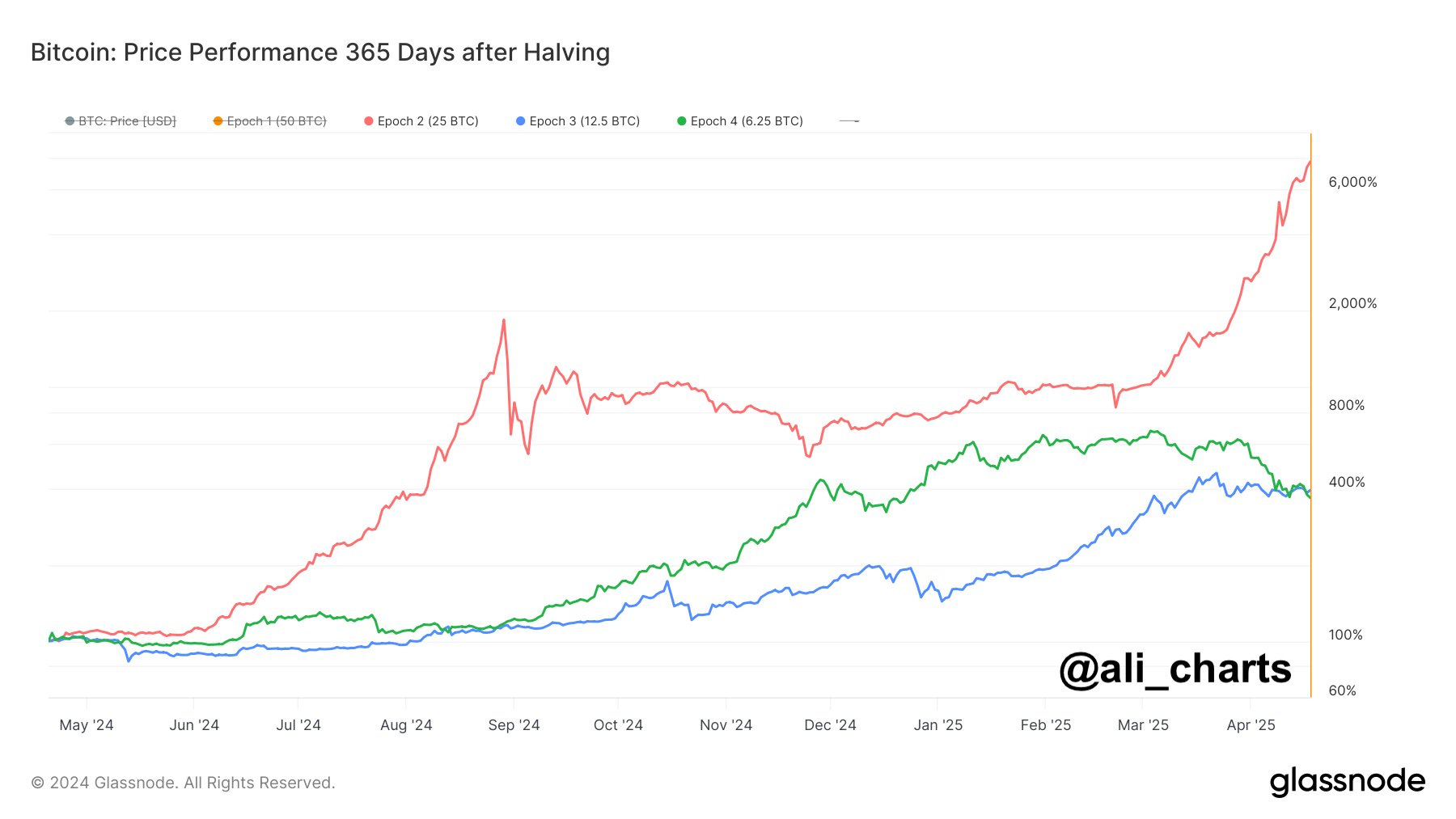 观察**次减半后一年内期间,比特币价格迎来了6,000%的上涨表现,第二次与第三次减半后,一年内比特币价格涨幅都落在大约400%。
