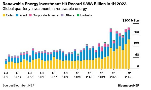 根据彭博新能源财经去年8月的数据显示,2023上半年全球可再生能源新增投资激增至3580亿美元,较去年初增长 22%,创下6个月来的历史新高。与此同时,相关的资本市场也迎来了迅猛增长。对可再生能源公司的风险投资和私募股权扩张承诺达到104亿美元,比2022年上半年增长25%。