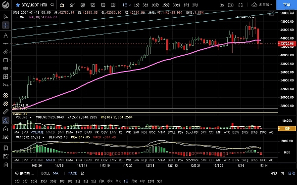 大饼文中提及切勿追高规避了风险,昨日行情整体呈震荡下行,晚间空头发力加速下跌**至41390一线支撑反弹,恭喜跟上思路的朋友空单大获全胜,目前币价在42790附近运行,四小时级别k线连续收长上影可见上方阻力较强,随后九连阴走出一波大幅回撤,macd空头逐步放量双线死叉向下,ma7拐头下穿多根均线形成死叉,可见空头力度较强,短期收针反弹但力度不大,加上周末行情**,预计走震荡修复的概率较大,日线级别如思路一致跌至ma60支撑反弹,多头暂时告一段落,后市行情会震荡下行或持续宽度震荡,关注周k若收阴下周将逢高做空为主,日内建议高空低多对待,上方压制43500-44300,下方支撑42000-41400