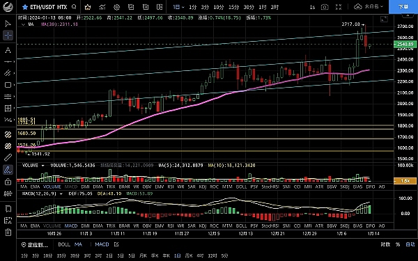以太坊昨日晚间再次上攻突破新高至2717一线受阻,随后行情迅速回落,低位跌至2458一线支撑反弹,恭喜跟上昨日思路的朋友多单获利100点,目前币价在2533附近运行,四小时级别价格虽突破新高但macd量能未跟形成顶背离结构,走出连阴回落,macd多头转空双线高位死叉,短期多头趋势打破,受ma30支撑行情止跌反弹,白盘预计不会有明显方向整体以震荡修复为主,日线级别k线阴包阳打破多头上涨,但下方支撑较强,预计回踩力度不会太大整体会走以横代跌的走势,临近坎昆升级有机会再冲一波,思路建议回踩低多为主高空为辅,上方压制2570-2620,下方支撑2500-2450