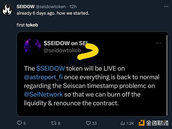 公平地说,团队购买自己的**供应以实现供应冲击,有时可能是相当看涨的,这并非罕见。然而,一个自称是早期 ETH、BNB、AVAX、SOL 和 SEI 投资者的「基础开发者」,因为他「实在没有 5000 美元可以投」而否认这是他的行为,似乎有点可疑。我的好奇心战胜了我,所以我开始更仔细地研究买家的地址和 Seidow Token。