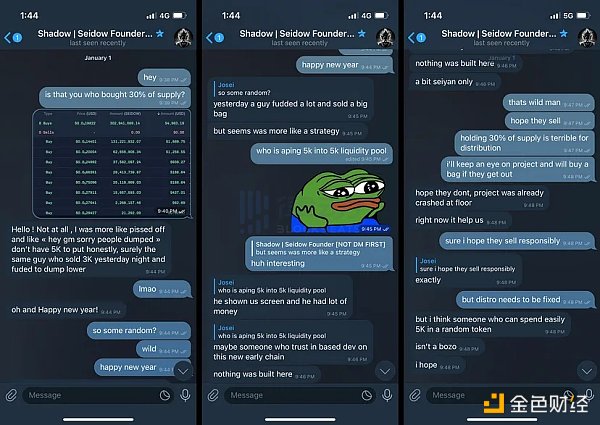在 Telegram 的一个小群聊中讨论 Seidow 的新上线时,我**次注意到了 Shadow。我的朋友 Josei(一个自称是 Seiscan 侦探的人)警告我,在****倾销后,当其开始增加交易量时,他注意到了一些可疑的交易活动。他提到一个钱包持续出价近 5000 美元的**,占供应的约 30%,而流动性池中的资金不到 10000 美元。他随后联系了开发者(Shadow),尽管开发者否认,他仍然不太确信。他说,「这位开发者自称是 based,逃跑」说得很准确。