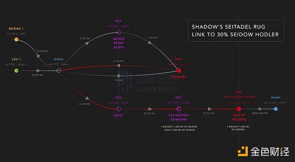 连接的钱包和 rug 项目的列表是****的(查看完整列表),然而,在经过几个小时的审查 Seiscan 之后,终于发现了 Shadow 的 rug 项目 Seitadel 与 30% 的持有人有关,这就是确凿的证据。