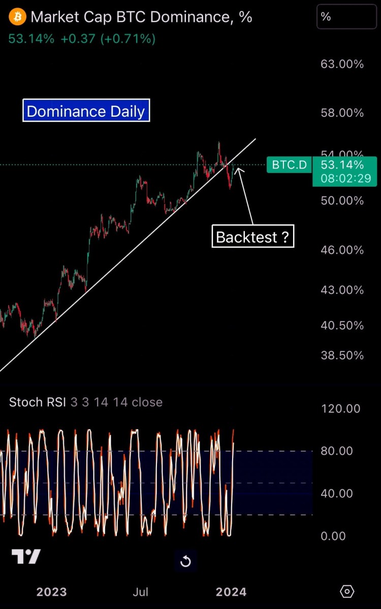 从纯粹的技术角度来看,比特币的主导地位正在回溯其最近的下跌。