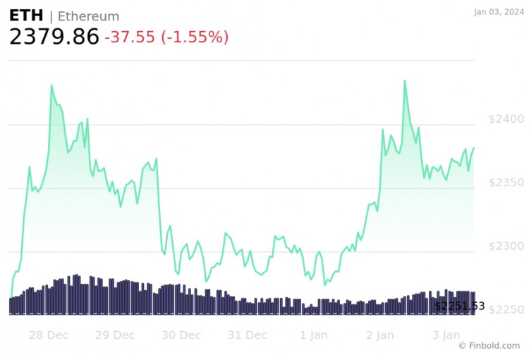 与此同时,根据**信息,以太坊以 2,379 美元换手,当日下跌 -1.55%,过去一周价格正变化 5.84%,月度图表上涨 5.38% 1月3日检索。