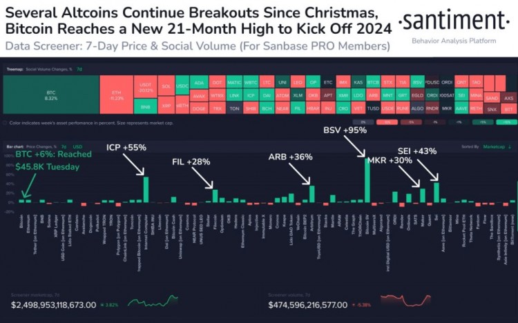 比特币市值持续上涨至 45,800 美元,达到 2021 年 4 月以来的**点,推动了各种山寨币在 2024 年初的积极发展轨迹。