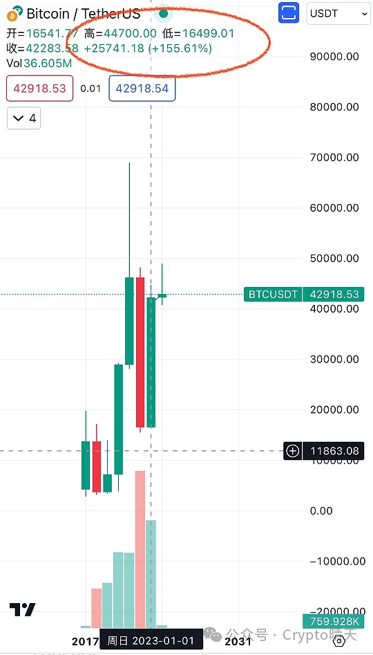 根据以上分析,我们可以做个不那么科学的推测。如下图,2023年BTC价格从16541到42283(开盘和收盘价),涨幅255%。如果4和3一样或略高于3,那么2024年假设涨幅在255% ,价格将达到107800左右或以上。2025年收小阳线收尾,本轮周期结束。