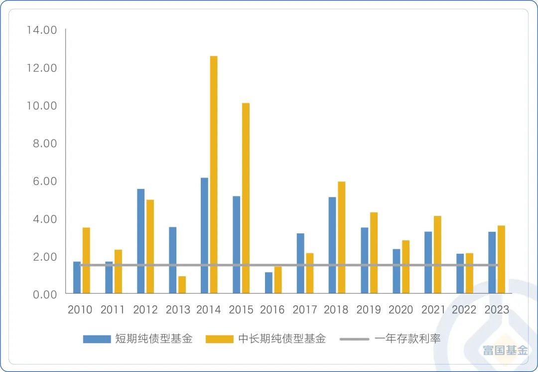 再看看过往表现,自2010年以来,短期纯债型基金指数历史每年的收益一般为正,且大多高于1年期定期存款利率。