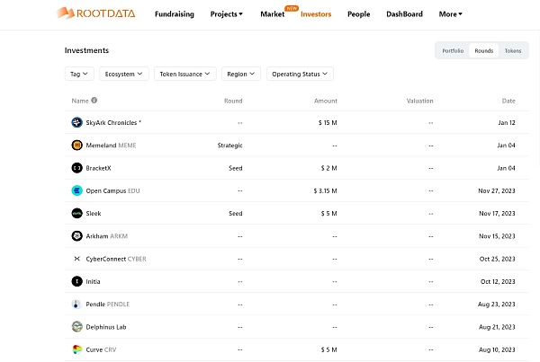 据Rootdata数据显示,2023年Binance Labs共参与了30个项目的投资,投资领域包括DeFi、基础设施、Gaming、AI等,且很多项目都是在其的种子轮、天使轮等阶段进行投资,甚至有的项目到了B轮。