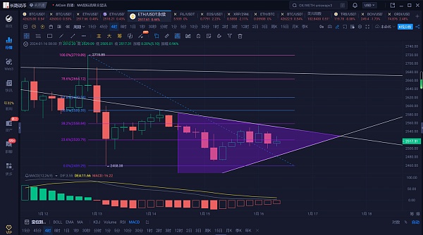 4小时线,自行情下跌以来跌破了4小时线中轨支撑后,连续反弹都没有突破4小时线中轨的压制,而随着布林带的缩口,行情将位于如图长路所画的三角形区域内震荡运行,上方可关注到斐波那契回撤线0.382处既下跌趋势线2558附近的压制,下方则可关注到下方上涨趋势线2485附近的支撑,整体会以震荡为主,今天操作上可看反弹,若是无法突破上方的压制,可继续空单进场。
