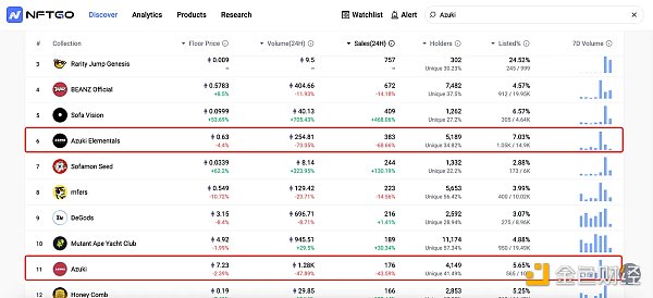 然而,随着整体市场行情的波动,由于并无后续动态和信息的公布,Azuki 的24H交易额又出现额较大幅度的回落。截至笔者1月8日下午14:00,Azuki 24H交易额跌幅-47.77%,Azuki Elementals 24H交易额跌幅 -73.39%,与之前的上涨形成剧烈反差。