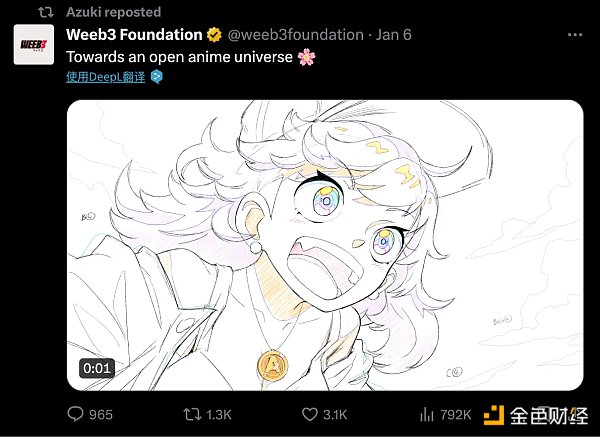 1月6日,Azuki 官方 X 账号关注并转发了 Weeb3 Foundation 向开放动漫宇宙进发的推文,Weeb3 Foundation 的 X 账号简介为“打造开放元宇宙,由 $ANMIE 驱动”。于是社区猜测可能是Azuki 在酝酿一些计划,甚至$ANMIE是Azuki即将发行的**。