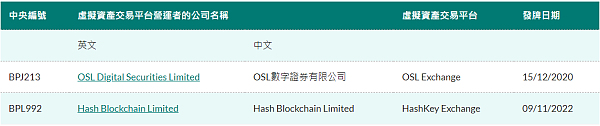 在虚拟资产交易平台方面,香港证监会仅给予了两家公司牌照,分别是 Hash Blockchain Limited(HashKey Exchange)和 OSL Digital Securities Limited(OSL Exchange),这两家公司获得的牌照均为第 1 类和第 7 类,也就是说,他们能在香港提供证券交易服务和自动化交易服务。