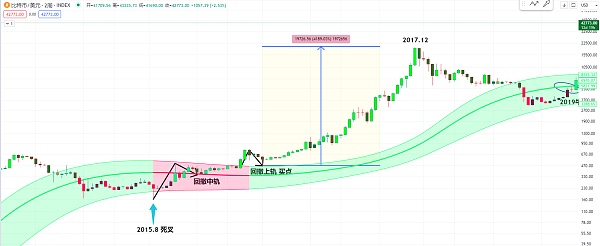 而且我们可以看一下在2015年也是有一个高斯通道2周的红色死叉 就是红色的通道放出来 我们可以看一下这里就是底部 所以我们再判断比特币目前的牛市 他跟2015年到2017年的周期是非常的像
