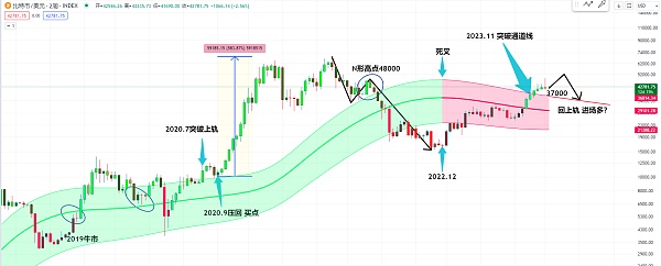 我们先来看一下比特币2周的K线图表这个非常传奇的高斯通道线 两周级别的这个高斯通道线 上次是在去年11月份突破之后 到目前为止他都还没有转绿 所以48000计划的高点8个月之前给大家预测的目前是已经到了