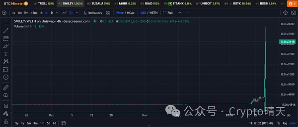 然后昨天半夜有兄弟发现了这个$Smiley,是马斯克推文的一张图里的表情包,藏的够深的。然后发出来我看了一下,池子100w,市值才300w,而巨魔($troll)池子200w,市值7000w,这个明显和其他meme有质的区别,大户最喜欢冲这种池子大的了,而且最近土狗行情蹭到mask的都会起飞,今天一看$Smiley果然也起飞了!目前已经很高了,不适合追。