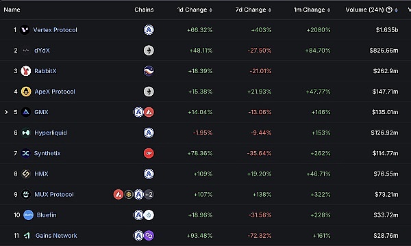 这一成就不仅使Vertex超越了如dYdX和GMX这样的老牌交易平台,更是稳稳占据了衍生品DEX市场的**位置。这一显著成绩不仅证明了Vertex的实力,也预示着它在DeFi衍生品市场中未来的领导地位。下文将为大家介绍其中的详情。