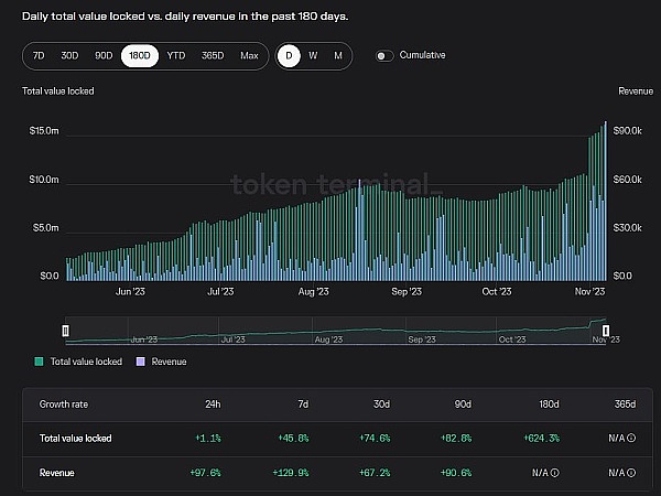在这样的背景下,Vertex Protocol的表现尤为抢眼,其交易量、总价值锁定(TVL)和收入的增长速度都达到了历史新高。特别是在去年11月,Vertex的表现令人瞩目:11月6日,其单日交易量超过了4亿美元,而在11月2日至11月7日的一周时间里,Vertex成为了仅次于dYdX的链上永续合约平台中交易量**的平台。这种快速增长的背后,与Vertex自身的独特特色、激励计划,以及即将进行的流动性引导拍卖(LBA)息息相关。