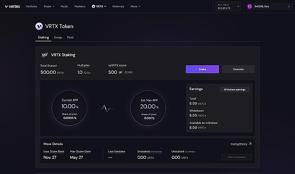 VRTX**的主要目的是促进Vertex社区的活跃度和协同发展。其主要功能包括质押和激励。其中,用户可以通过抵押VRTX为Vertex生态系统的安全做出贡献。Vertex引入了「VE」模式,根据抵押时间长短生成voVRTX分数,激励用户长期持有和参与;为协议的不同程度贡献者提供奖励,以激励持续的参与和支持。