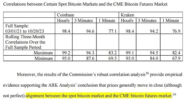 BTC 期货在 CME 已经是合规产品。因此,证明 BTC现货与 CME 中 BTC 期货的价格相关性是**选择。由此,SEC 对比 Coinbase 和 Kraken 两家加密交易所的 BTC 价格与 CME 期货价格的自 2021 年开始的相关性,发现两者高度相关。这就意味着如果 BTC 现货市场出现欺诈或操纵行为,这些行为很可能也会影响期货市场,从而被 CME 的监控系统所检测,从而监管可以进入控制风险。