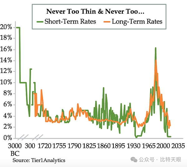 DanielleDiMartinoBooth提供的这张图表。正如您所看到的,为应对2008年全球金融危机(GFC),利率被推至5000年来的**点。
