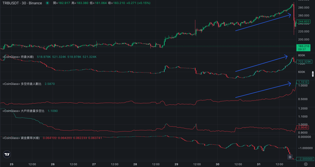 该笔者也提到,TRB在币安上的资金费率来到上限的-2%,OKX则是-1.5%;前者4小时结算一次,后者则是8小时结算一次。