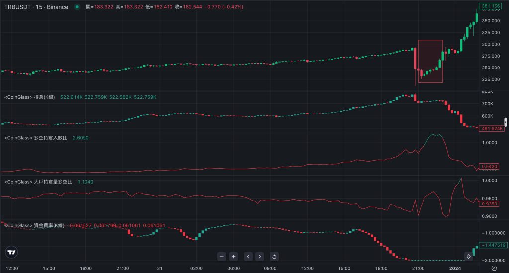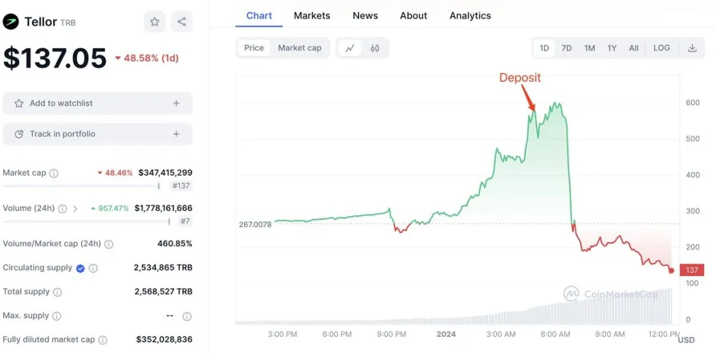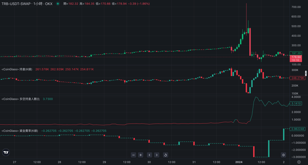 2023年跨越到2024年的**天,TRB**的价格在短短一天内飙升了139%,流通市值更翻了1倍,来到15.2亿美元。随后,价格暴跌了70%,上述波动都在一天内开始并结束。