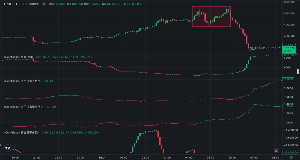 接着,多空持仓人数比在暴跌后持续上升(红框处),显示散户倾向做多(呈现绿色)。