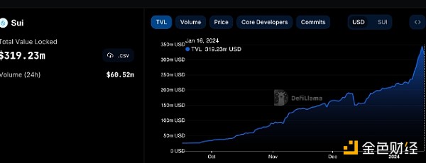 DeFi 数据聚合商 DefiLlama 的数据显示,SUI 的总锁定价值 (TVL) 在过去三个月中也一直在增长,较 10 月初的 5439 万美元增长了 828% 以上。 到 2023 年,现值将达到 3.1923 亿美元。
